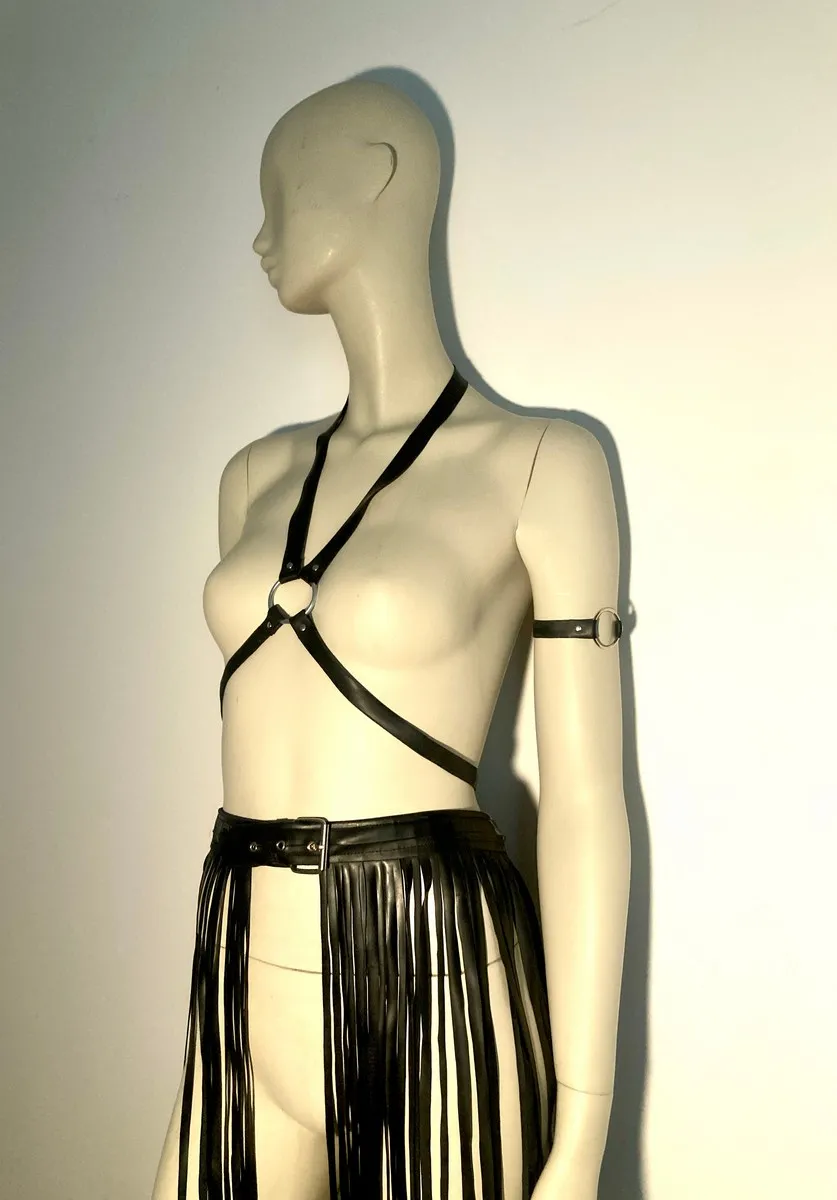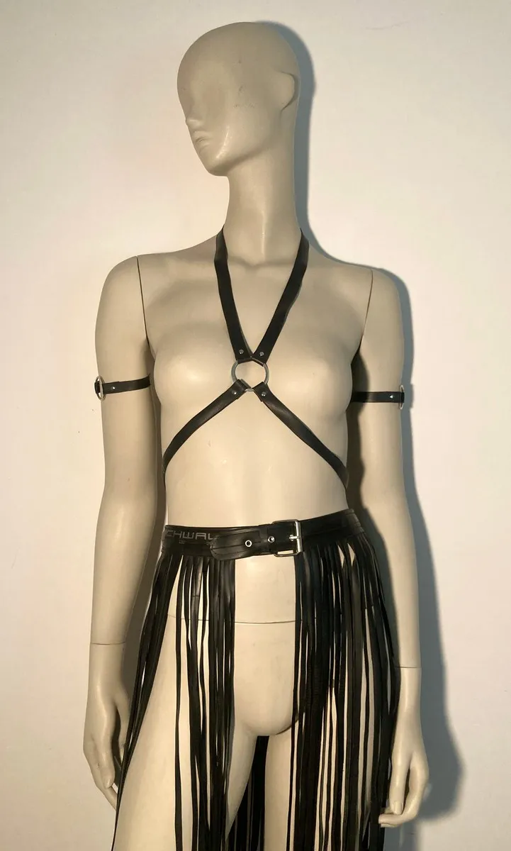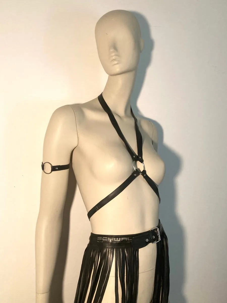 Body chain made from upcycled bicycle inner tubes. Inner tubes look like leather, but are vegan and sustainable. This chain looks like a simple harness and can be very well combined with the biceps bands.