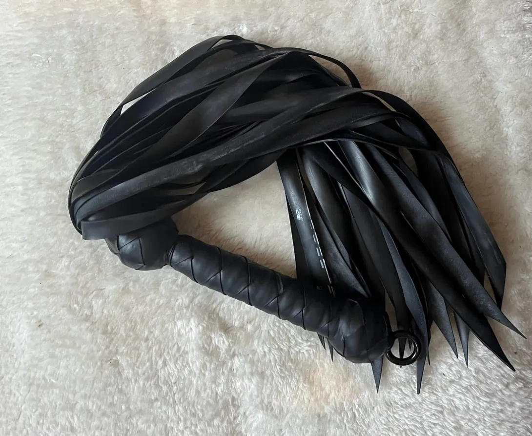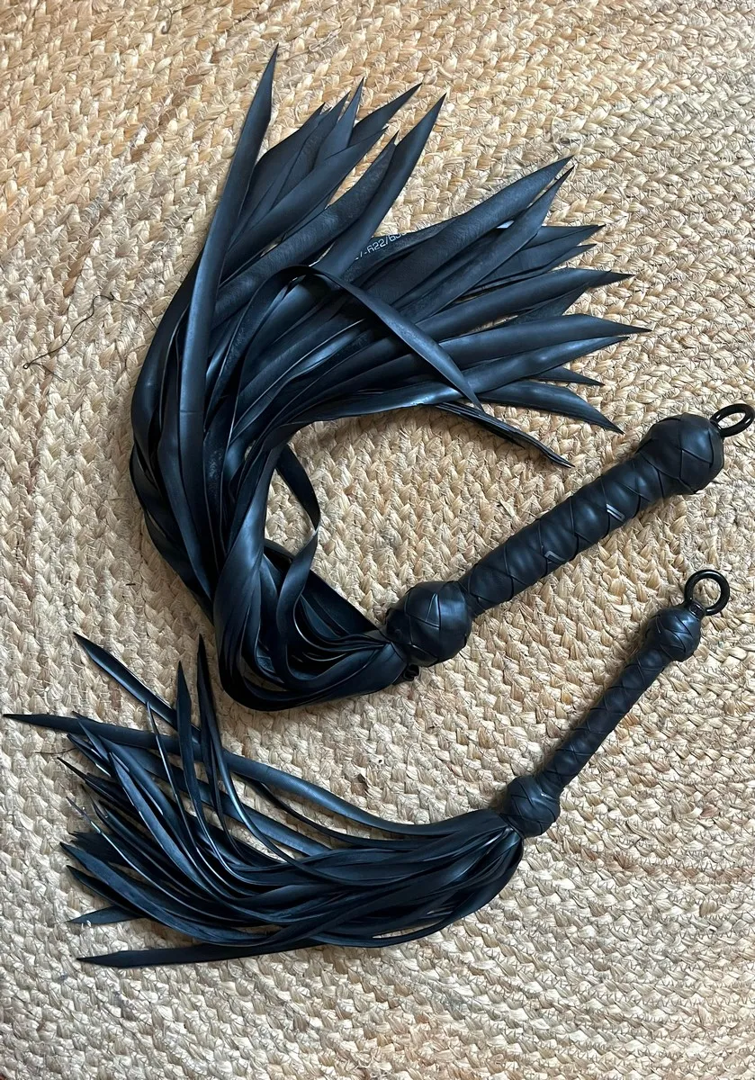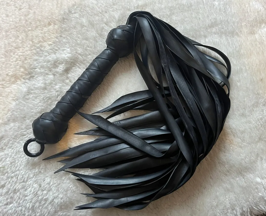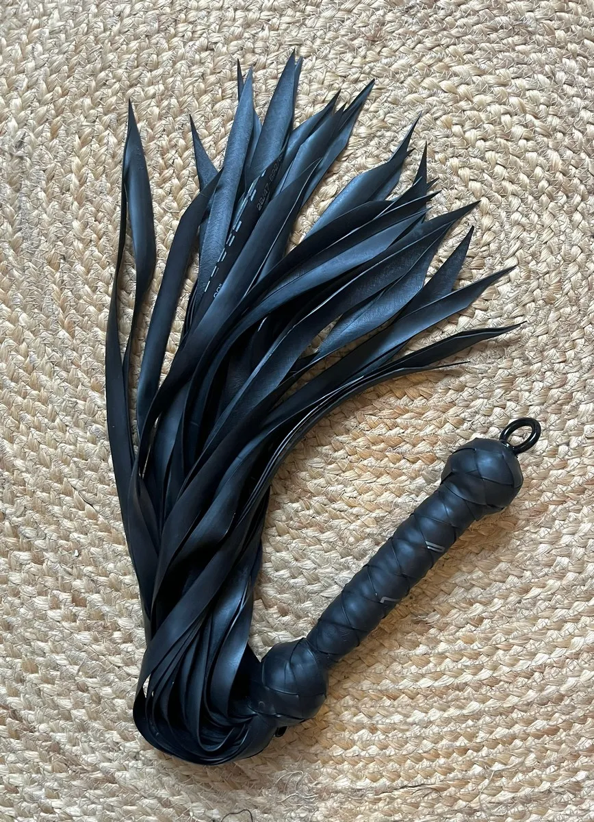 Eco-friendly flogger made from upcycled inner tubes, with ring.