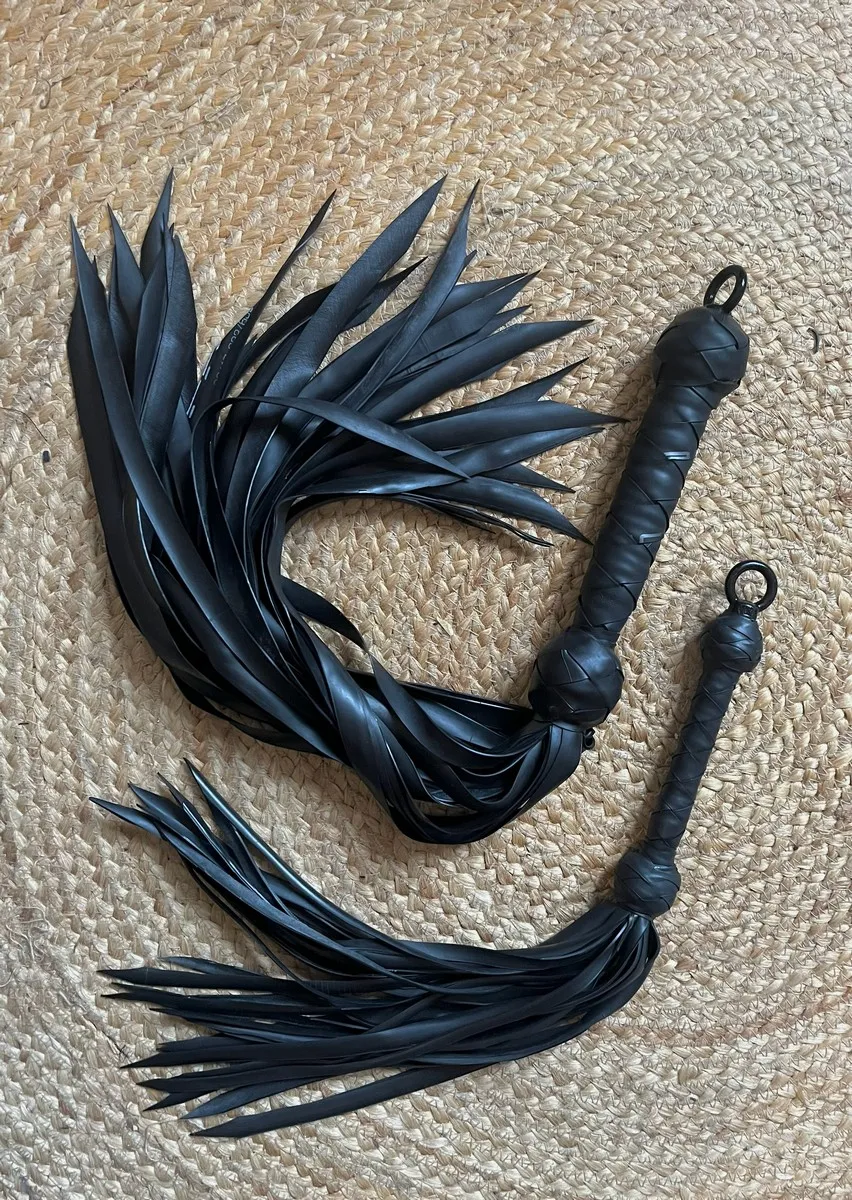 MAXI is the biggest version of the available floggers. It has a thicker handle of approx. 3 cm (the circumference is 10 cm). The handle is 20 cm long and the strings 40 cm.