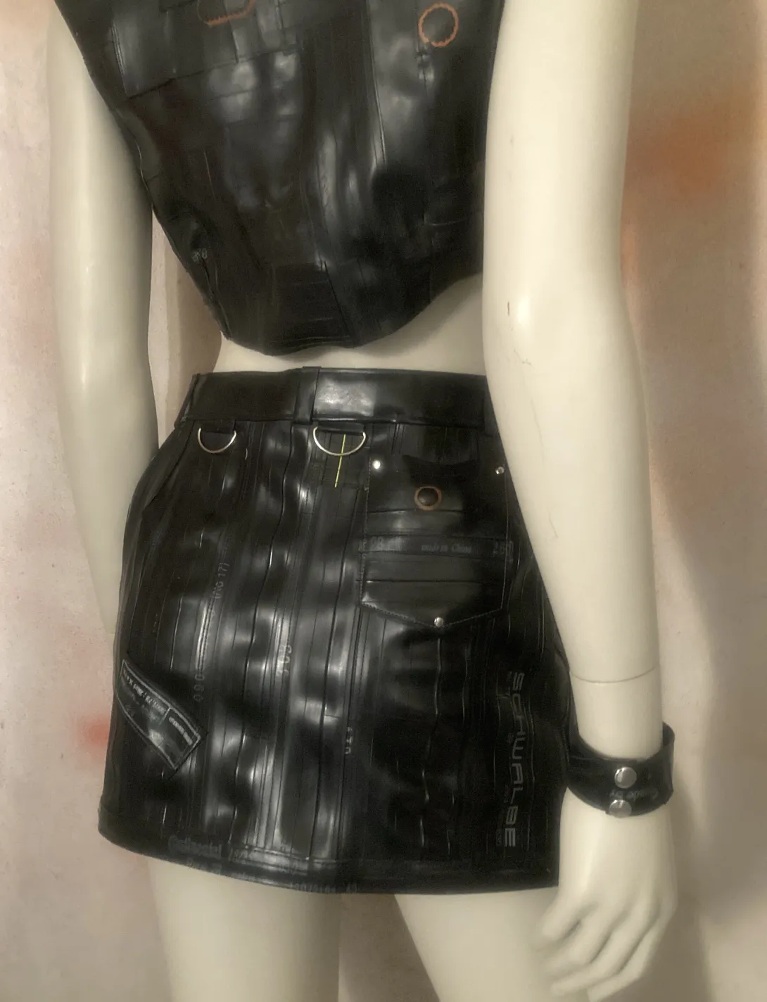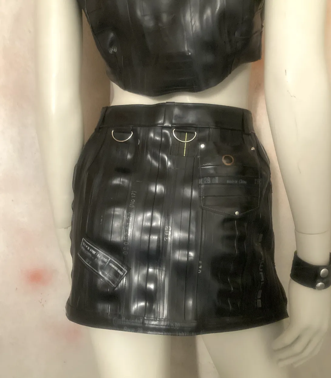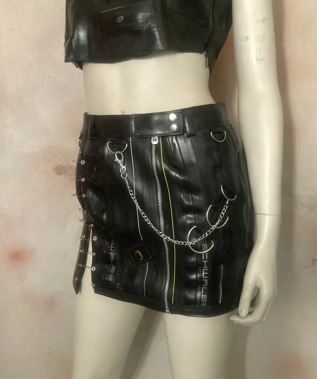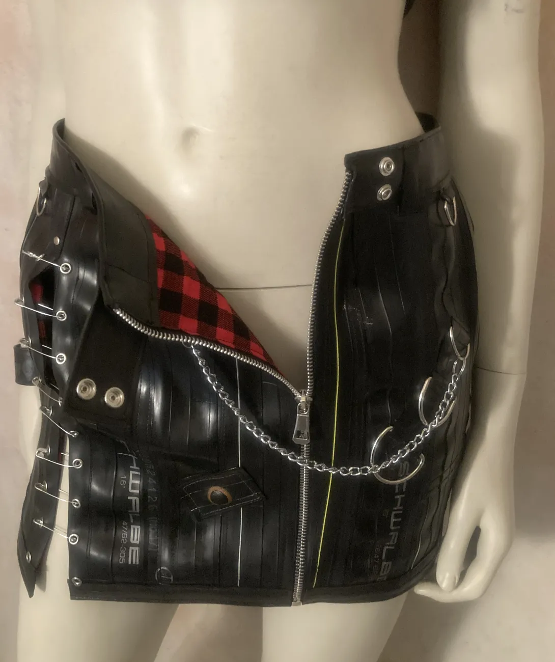 This mini skirt is made from upcycled bicycle inner tubes, with one zipper and a closing with eyelets (can be closed with a string or pins) and several decorative rings. Each skirt is unique, you can order something specific made for your size, that will look approximately like this one!