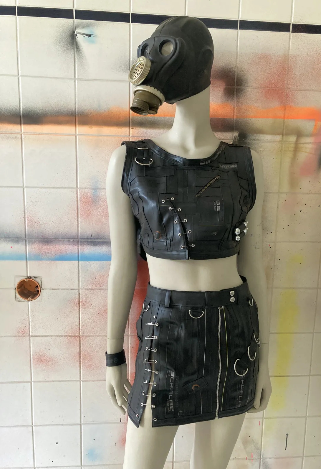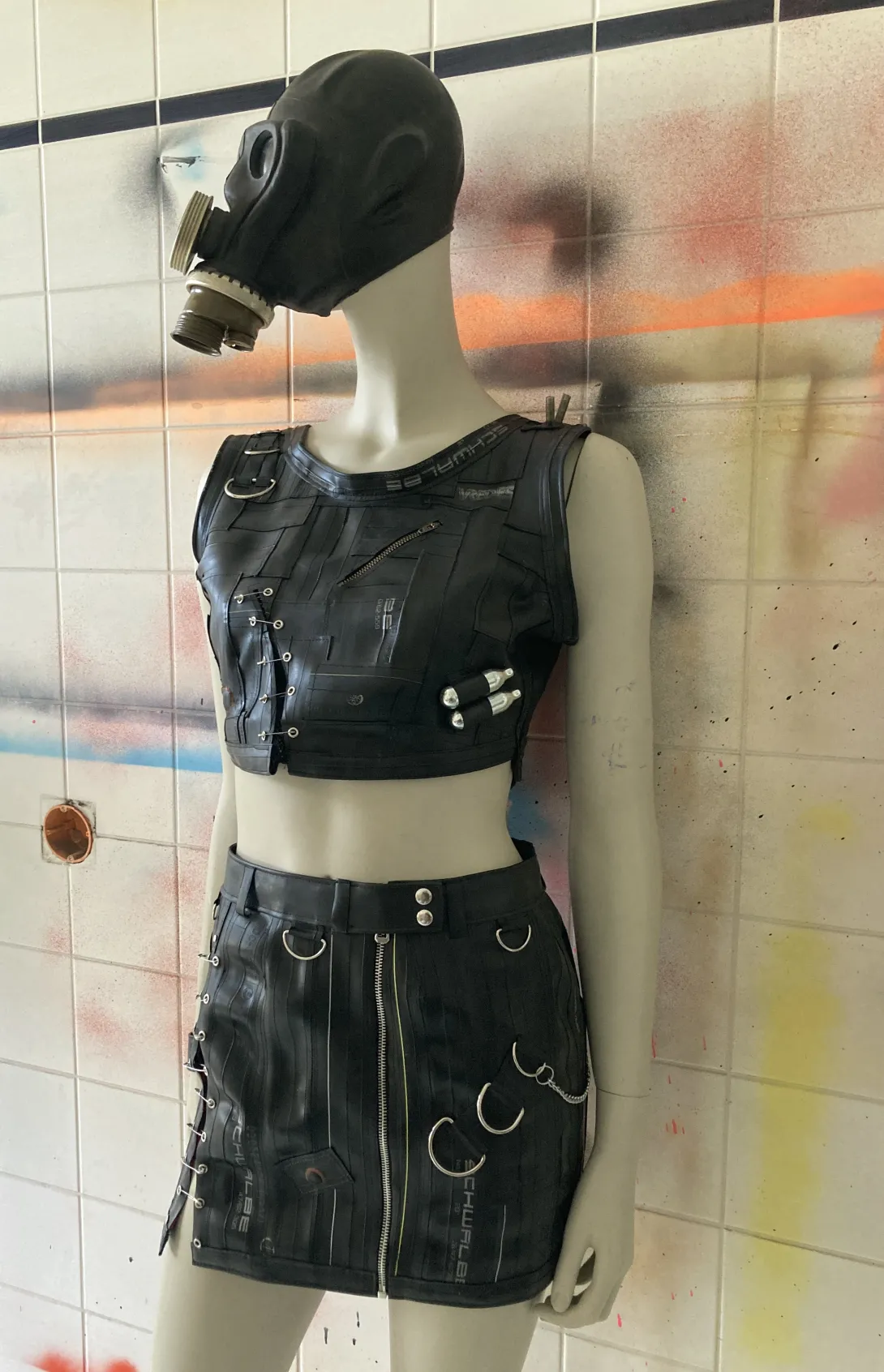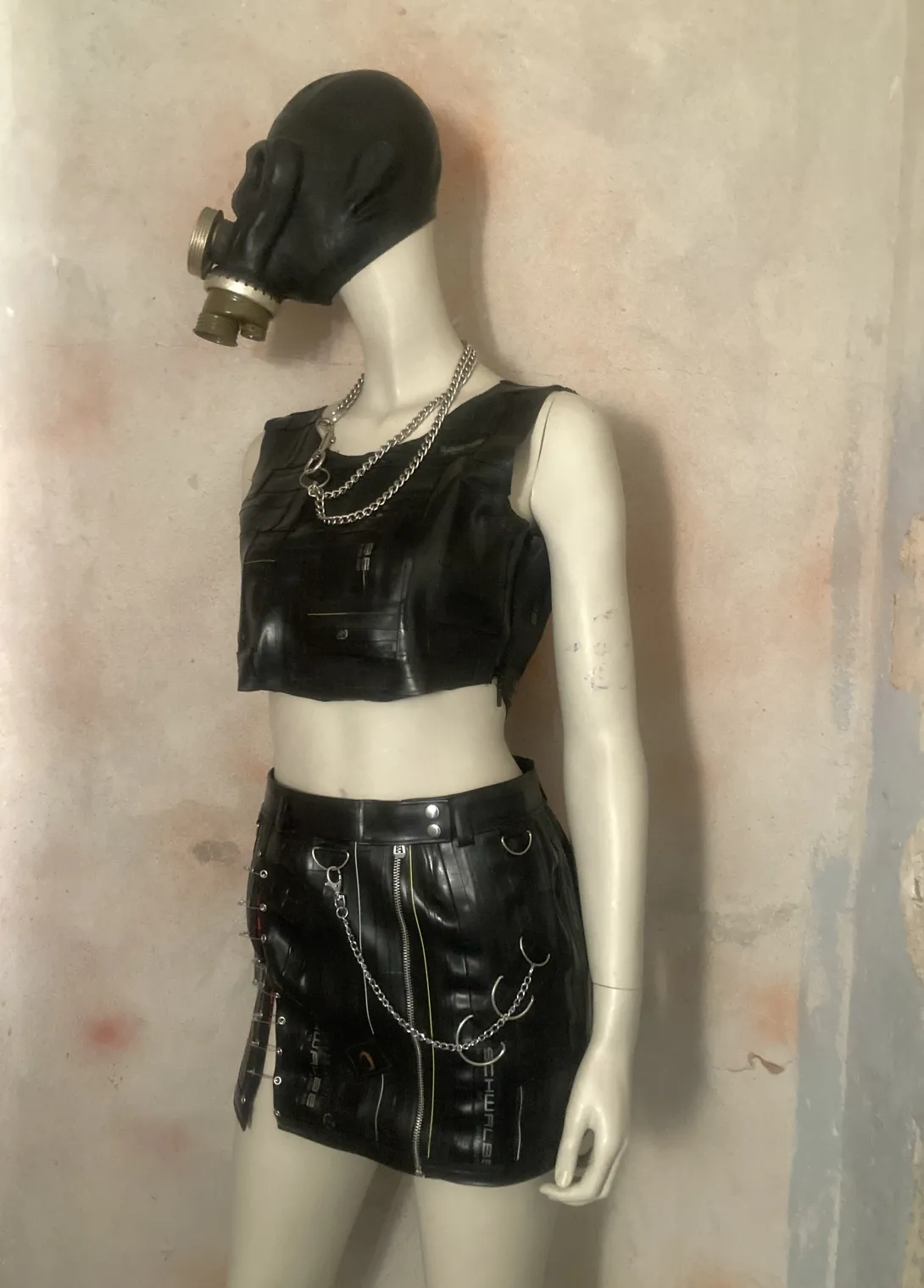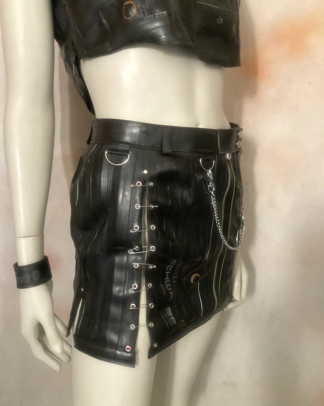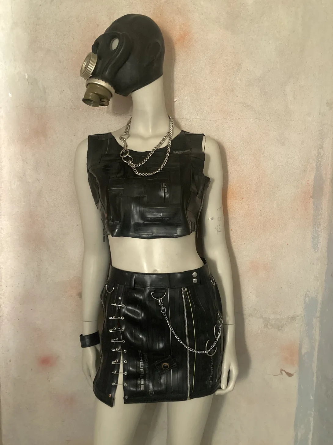 This mini skirt is made from upcycled bicycle inner tubes, with one zipper and a closing with eyelets (can be closed with a string or pins) and several decorative rings. Each skirt is unique, you can order something specific made for your size, that will look approximately like this one!