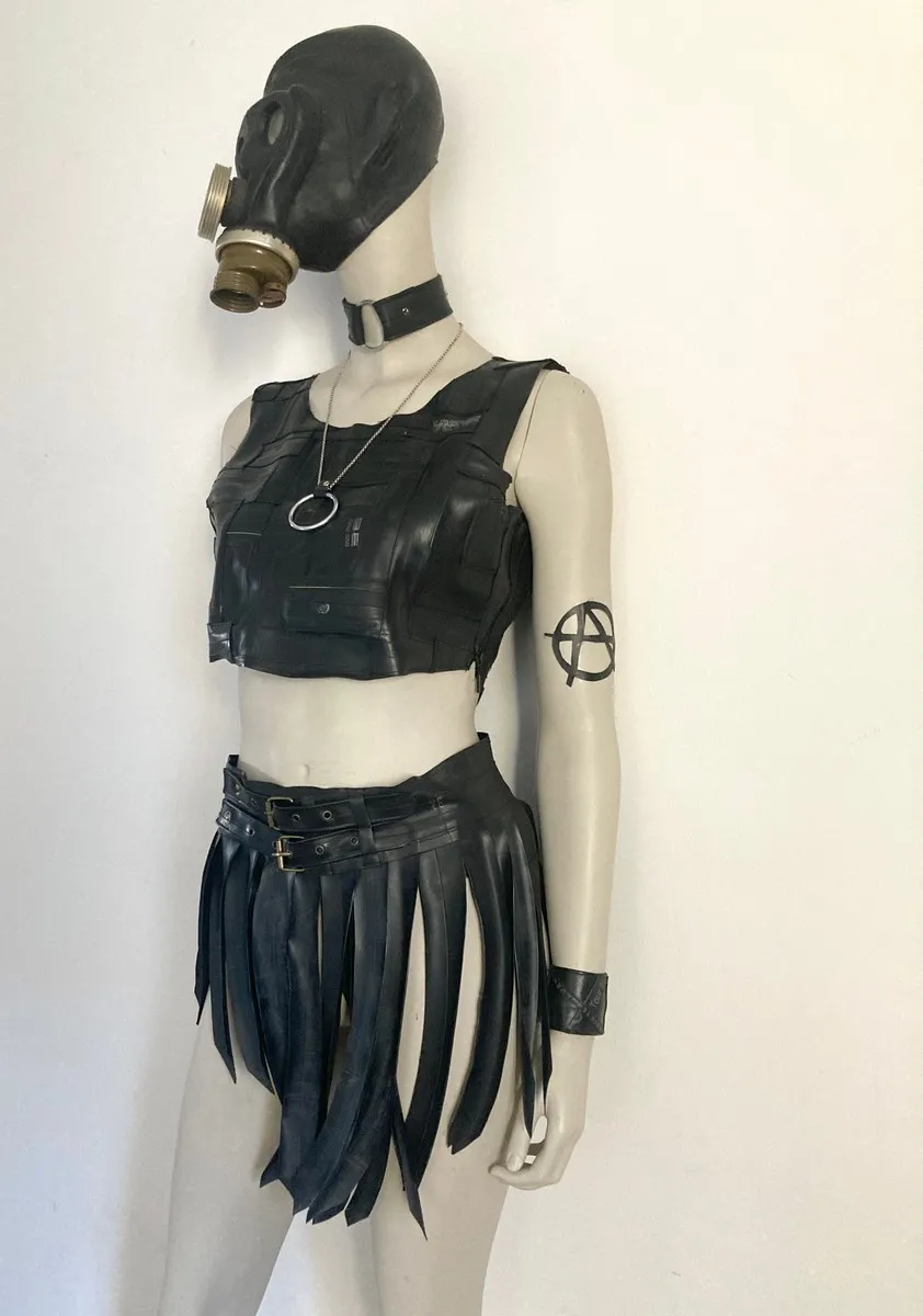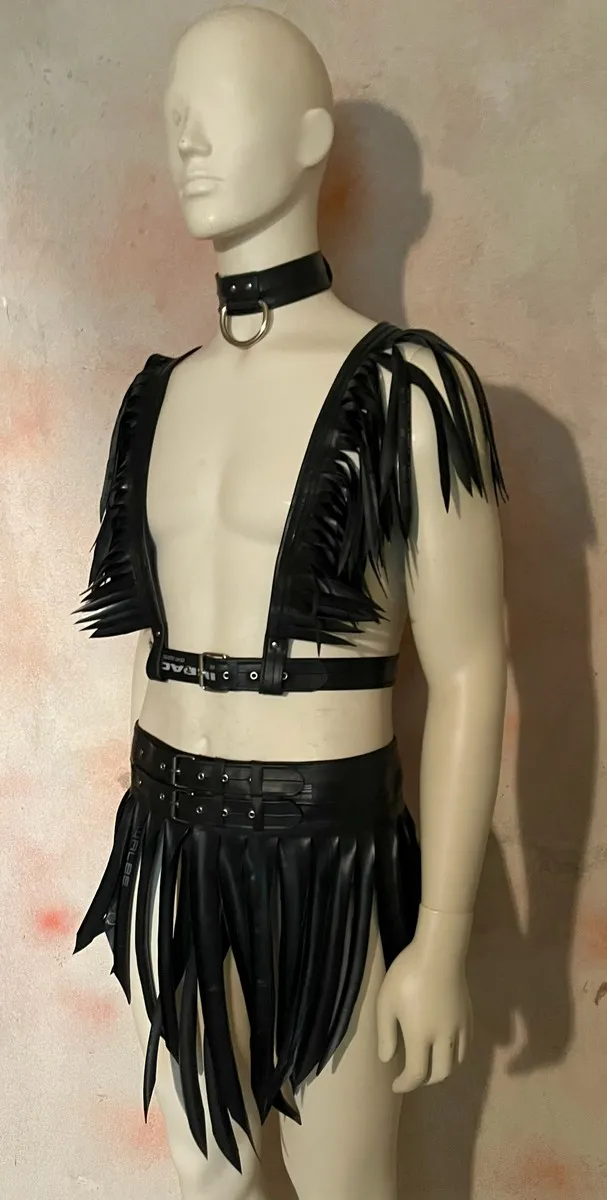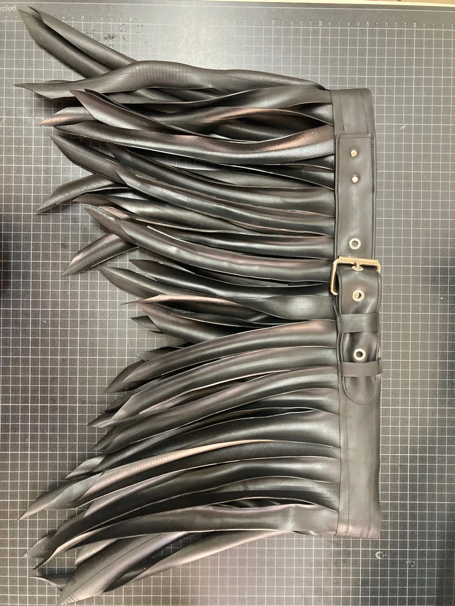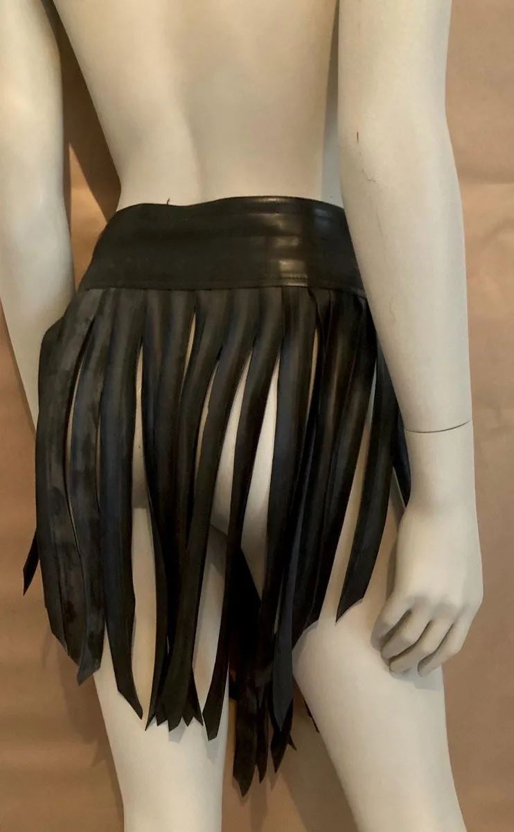 Fringe skirt (gladiator/warrior style) made from upcycled bicycle inner tubes. Inner tubes look like leather, but are vegan and sustainable. This unisex model looks great on everybody and perfect for a night out.