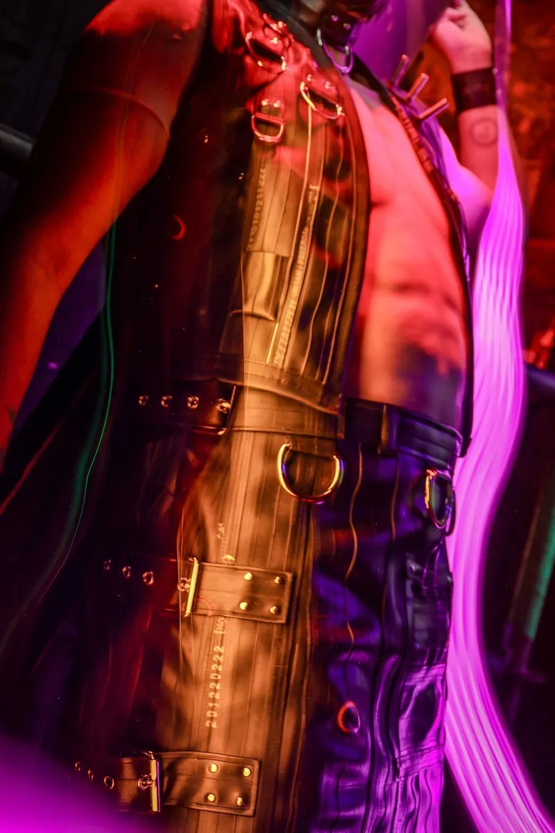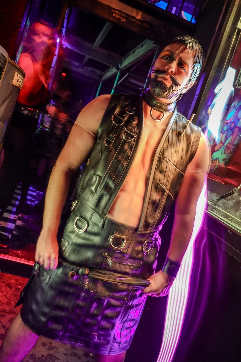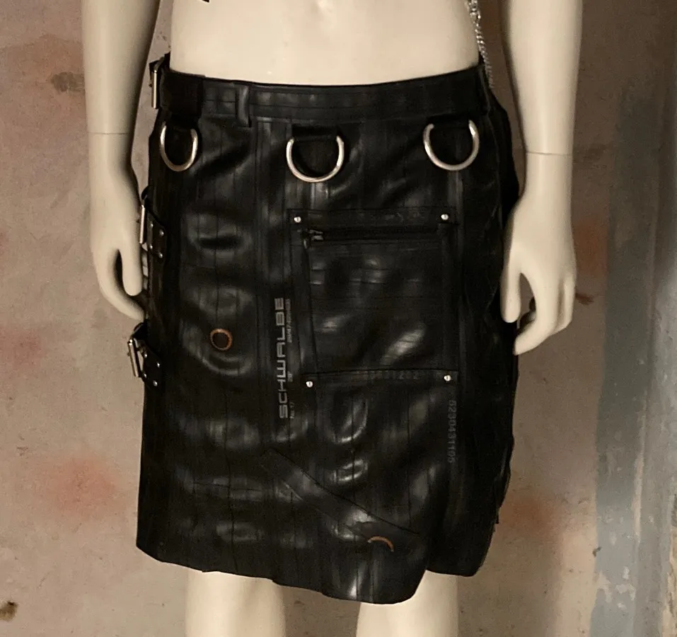 Kilt skirt made from upcycled bicycle inner tubes. Inner tubes look like leather, but are vegan and sustainable. Bring out your masculine side with this unique kilt.
