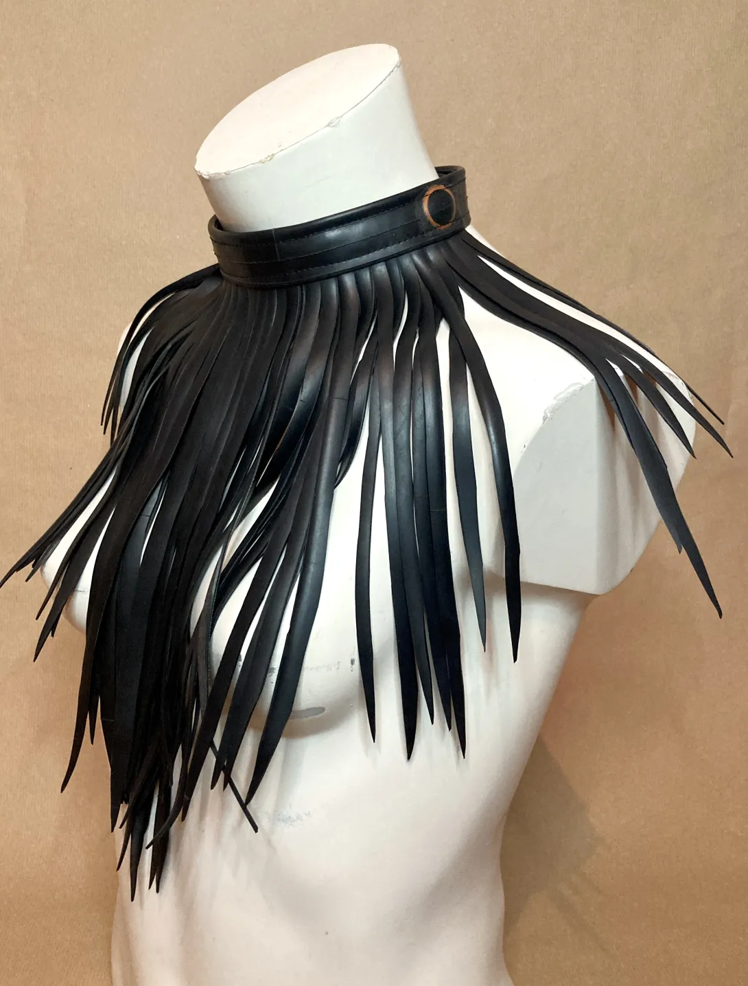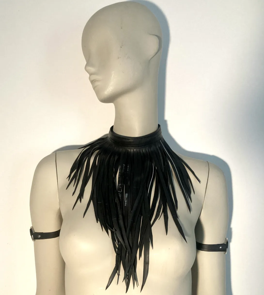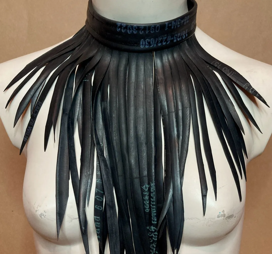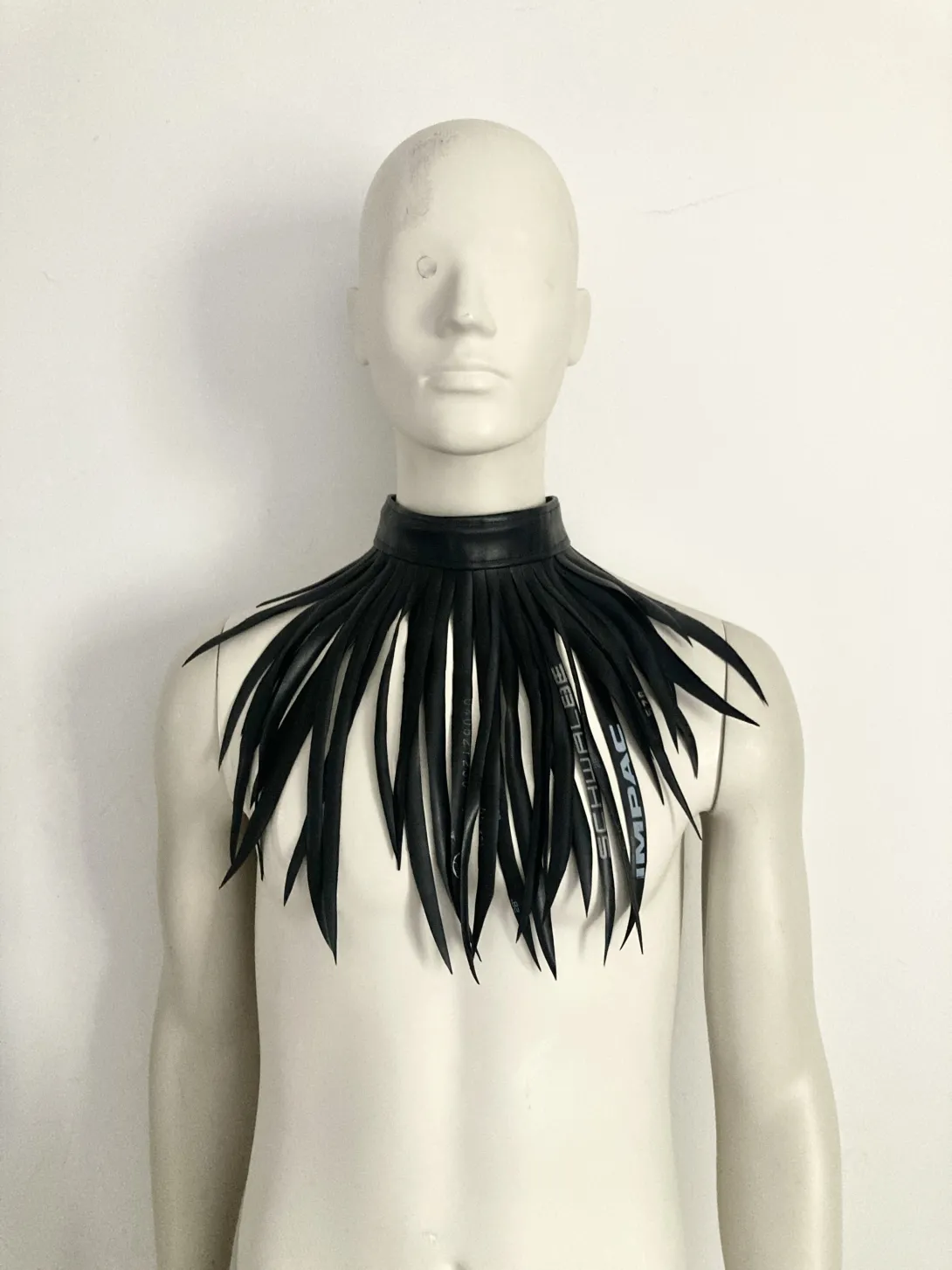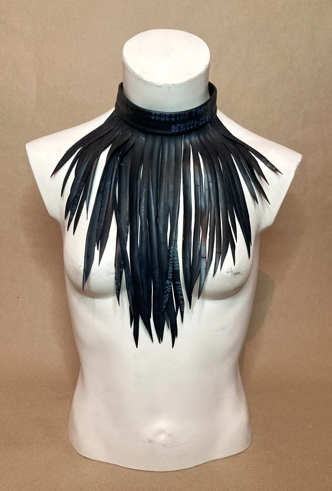 This eco-friendly necklace choker is crafted with care from upcycled bicycle inner tubes. This unique collar has a double layer of thin fringes, all cut and sewn by hand! This will definitely spice up your outfit.