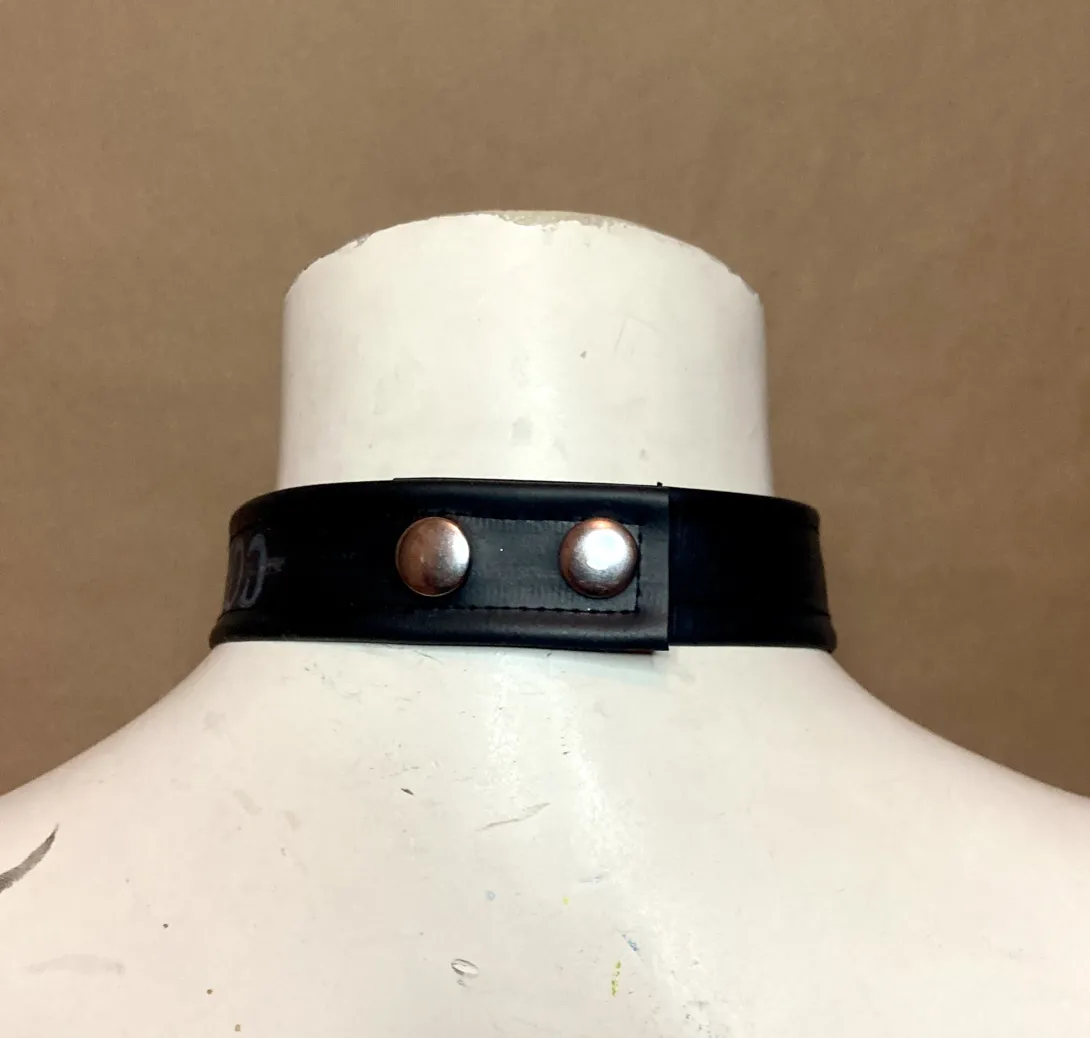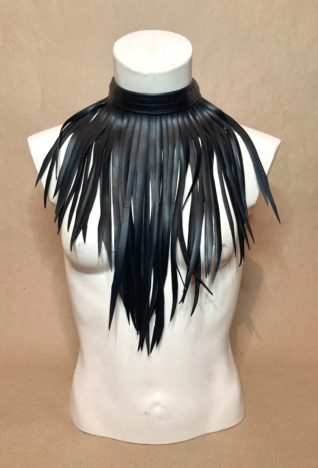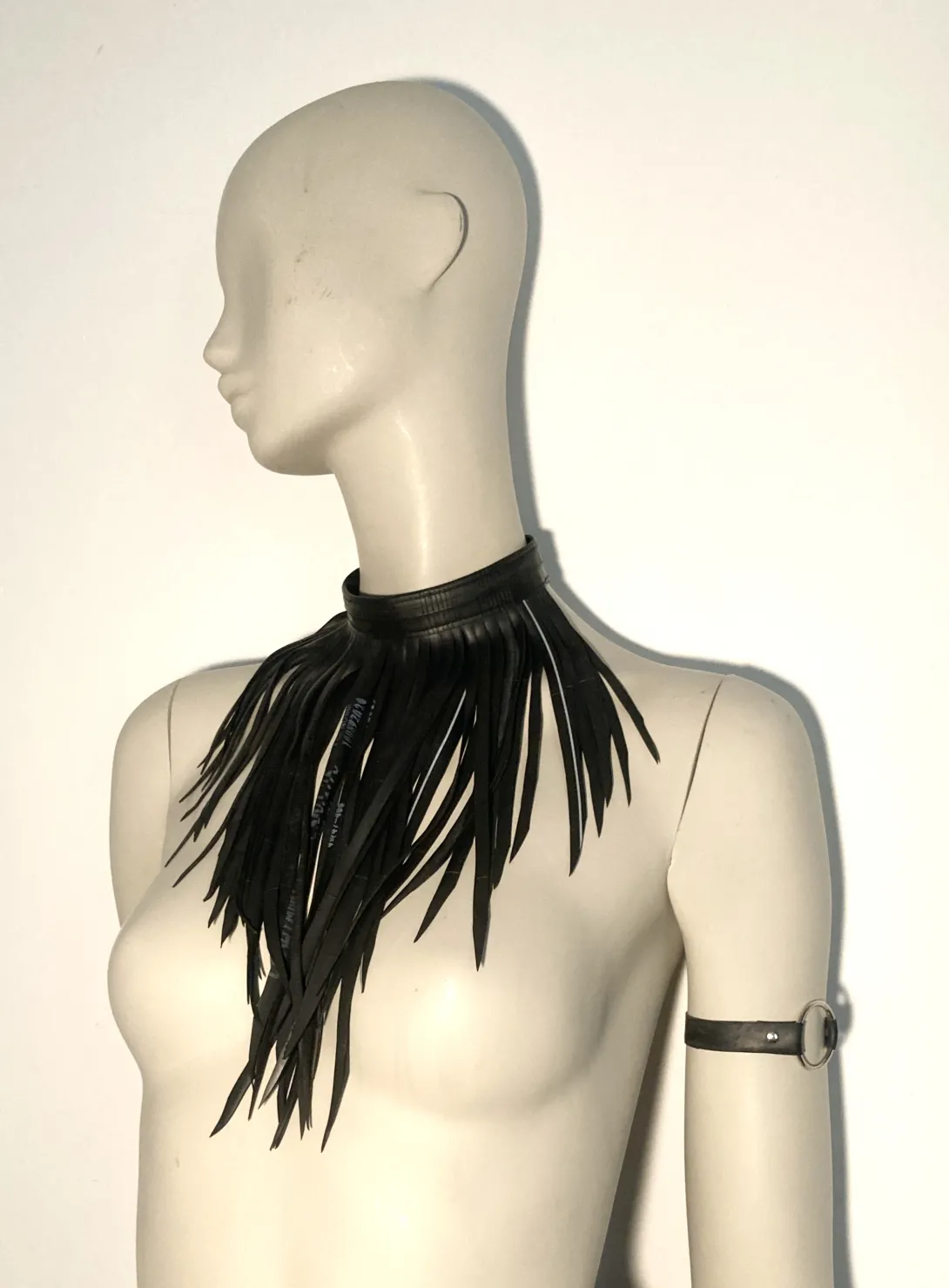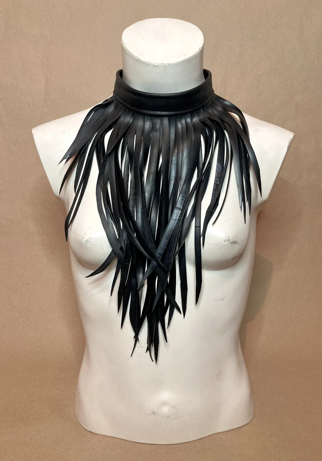 This eco-friendly necklace choker is crafted with care from upcycled bicycle inner tubes. This unique collar has a double layer of thin fringes, all cut and sewn by hand! This will definitely spice up your outfit.