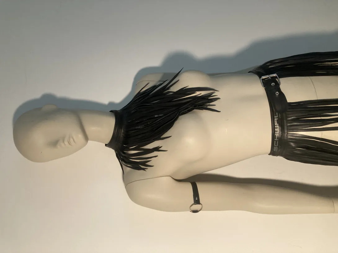 The necklace is closed with two buttons (metal). The fringes are approximately 5 mm wide and range from around 10-25 cm long (double layer). All made from discared bike inner tubes: rubber (butyl).