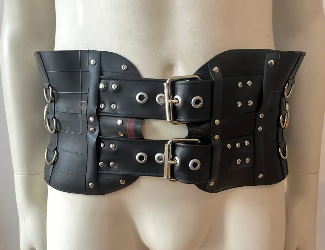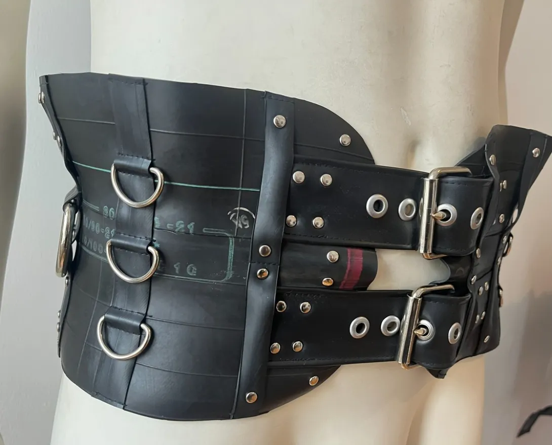 This waist cincher / corset belt is handmade from upcycled motorbike inner tubes, featuring metal D-rings and rivets, and a lace-up front closure.